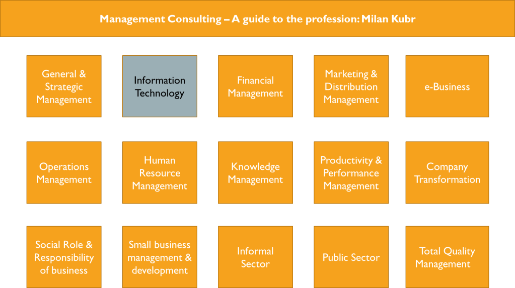 This framework highlights the Management Consulting areas as follows, with Information Technology shown as a distinct consulting discipline where the subjects of data and analytics are dealt with.