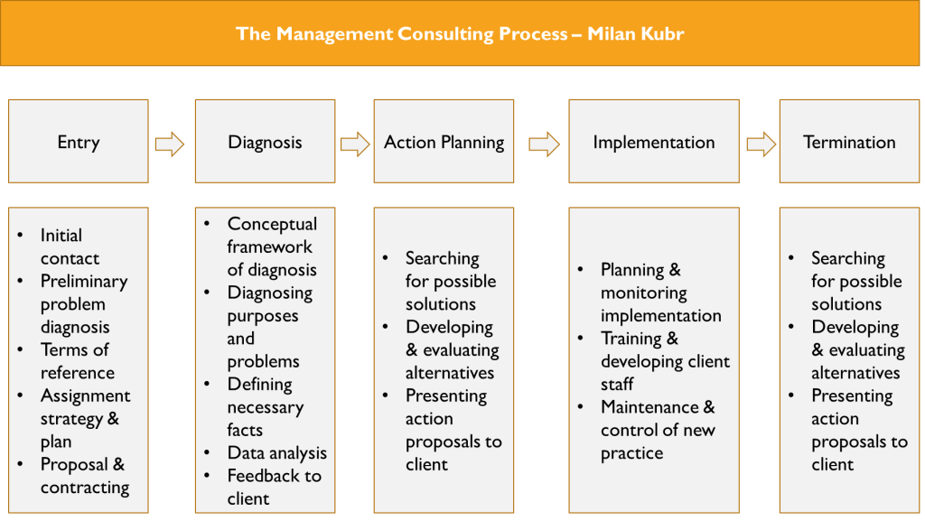 – Helping companies develop Tech strategy & AI stack aligned to business strategy – Learning and development of staff in new skills such as ‘prompt engineering’ – Guidance / counsel on data protection and regulatory compliance – AI triggered business model transformation of software companies – Emerging paradigms with Information Infrastructure & Information Security – Enhanced knowledge management content and tech for ‘point of use’ applications – Public Sector: Information Security and Infrastructure Strategies for National SecurityThe Management Consulting process as articulated by Milan Kubr is illustrated as follows: –