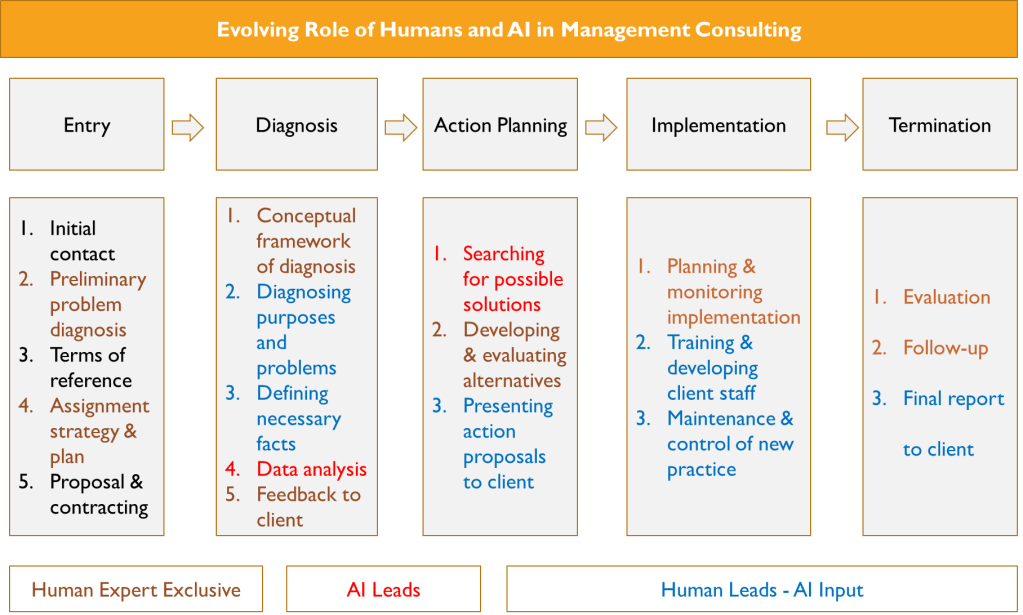 Given the emergence of LLMs bolstering AI capabilities, some of these phases of consulting can be AI led and AI enabled as illustrated below.